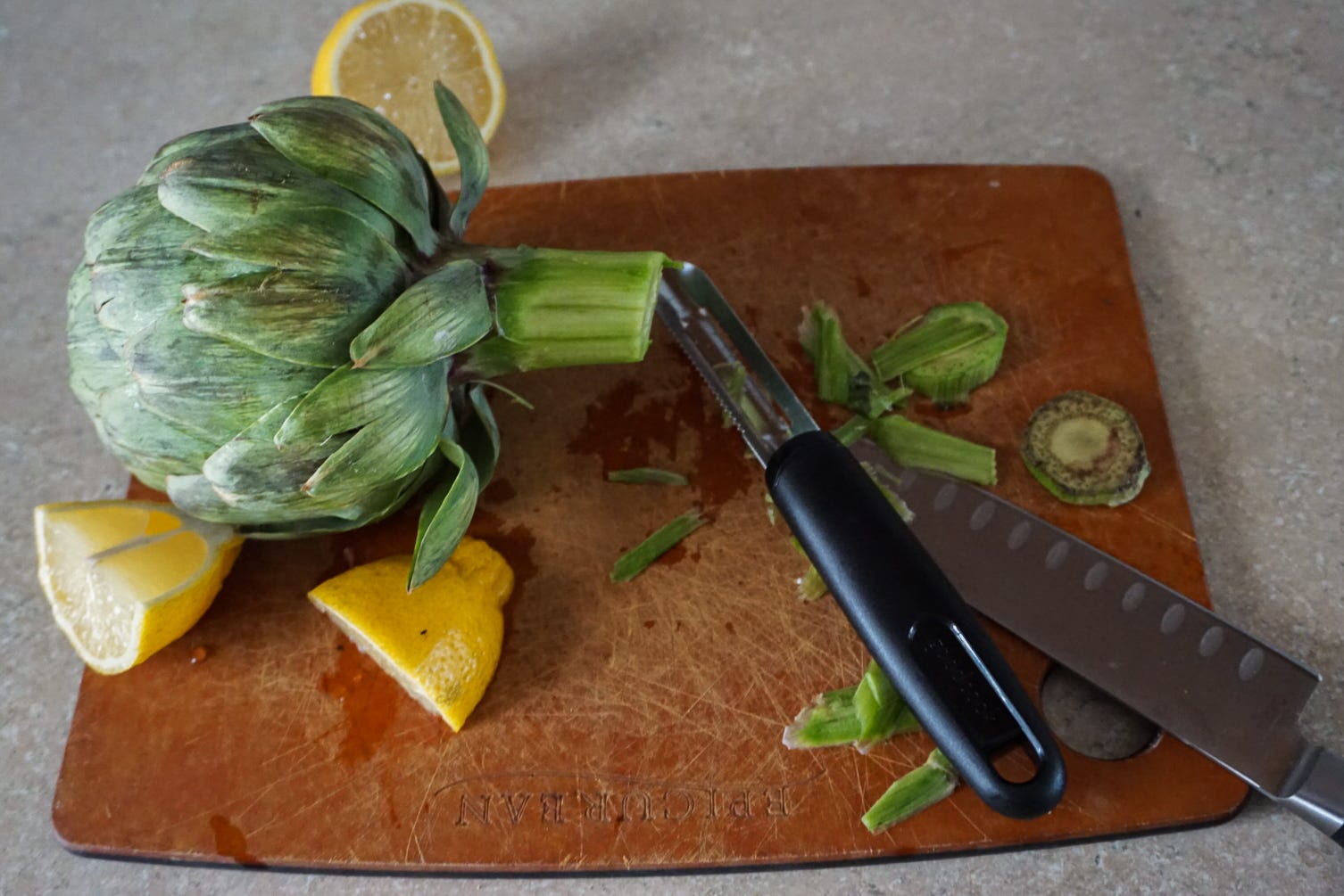 Step two: Take a peeler to the stem of the artichoke, then rub all exposed areas (the now-flat top of the globe where the cut was made and all over the stem) with lemon. This helps with flavor and prevents the artichoke from browning.